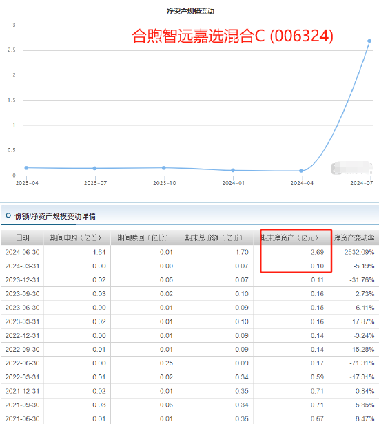 合煦智远嘉选混合C(006324)二季度规模暴增,从0.1亿元,增加至2.7亿元。